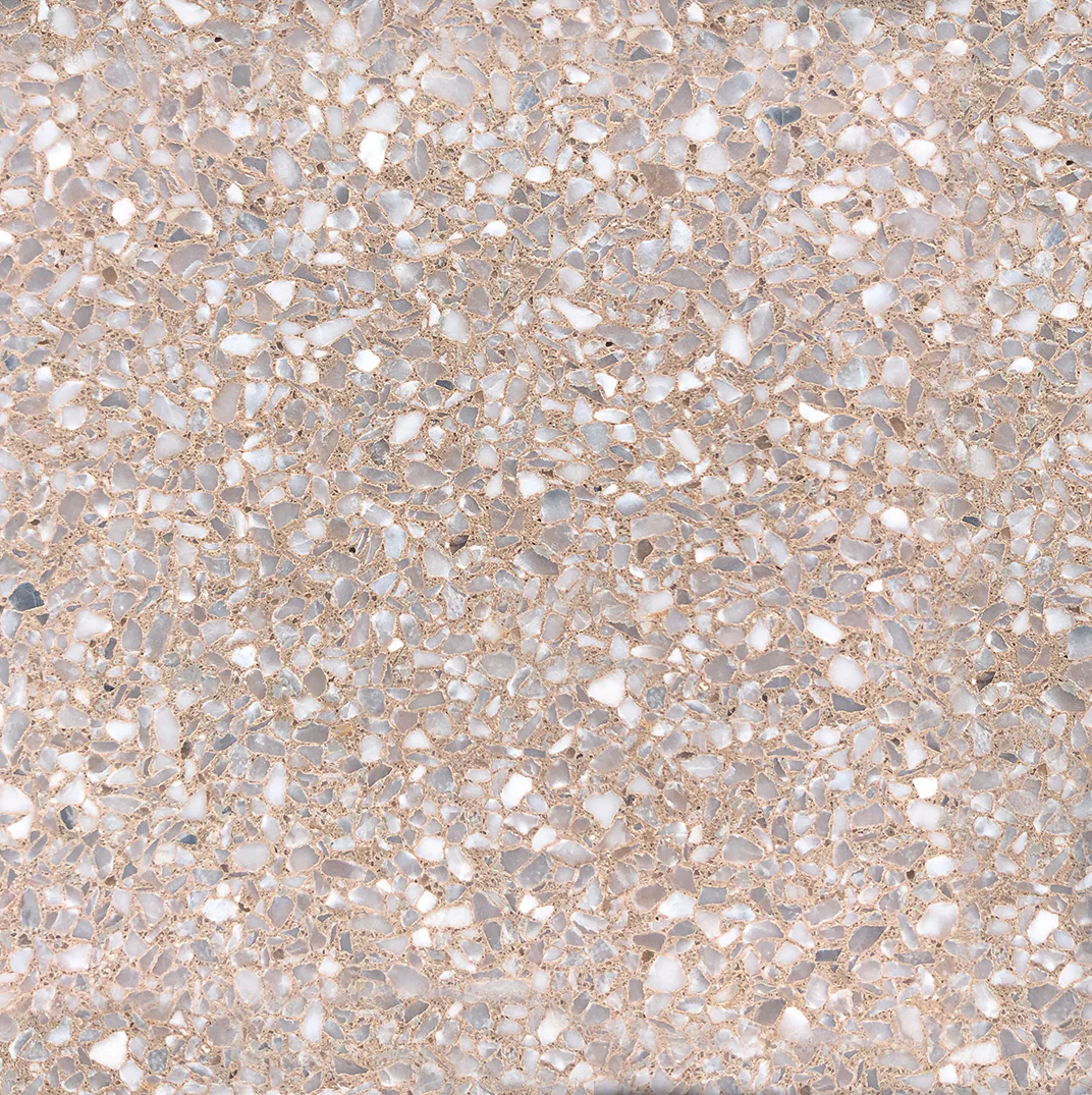 these geometric patterns incorporate half moon and crescent shapes that are boldly architectural and deco inspired, softened in our extra small marble chip signature terrazzo finish. the curved shapes can configure with the solid and lined tiles to create the overall design.